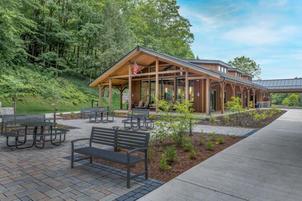 Located at the base of the lower falls, the building features a rentable multi-purpose event space, offices for County staff, large exterior overhangs, and a spacious courtyard. Fully accessible, gender-neutral restrooms, located in a separate structure, are available when the main building is closed. Designed to honor the property’s history, the building incorporates elements inspired by the original home. This includes a stone fireplace and timber frame portico, while providing improved access to the falls and trail network for the community to enjoy.