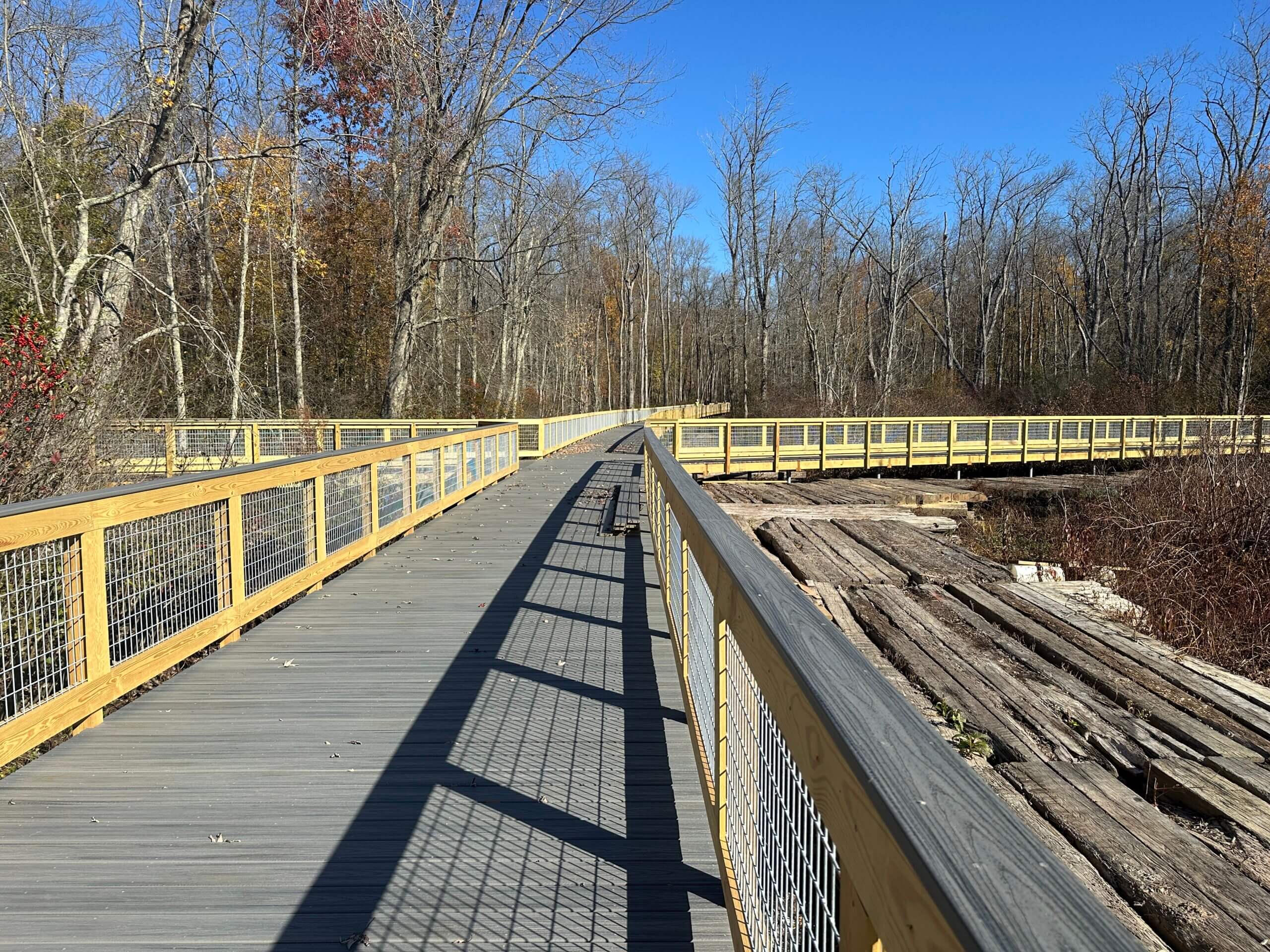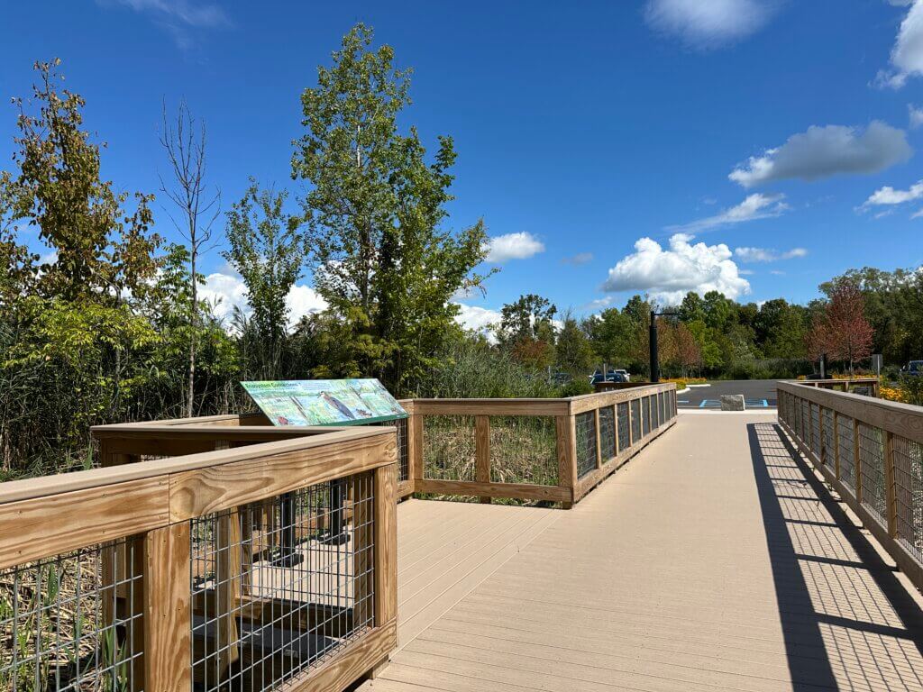 A thoughtfully placed overlook midway offers a peaceful pause and panoramic views of the wetlands.
