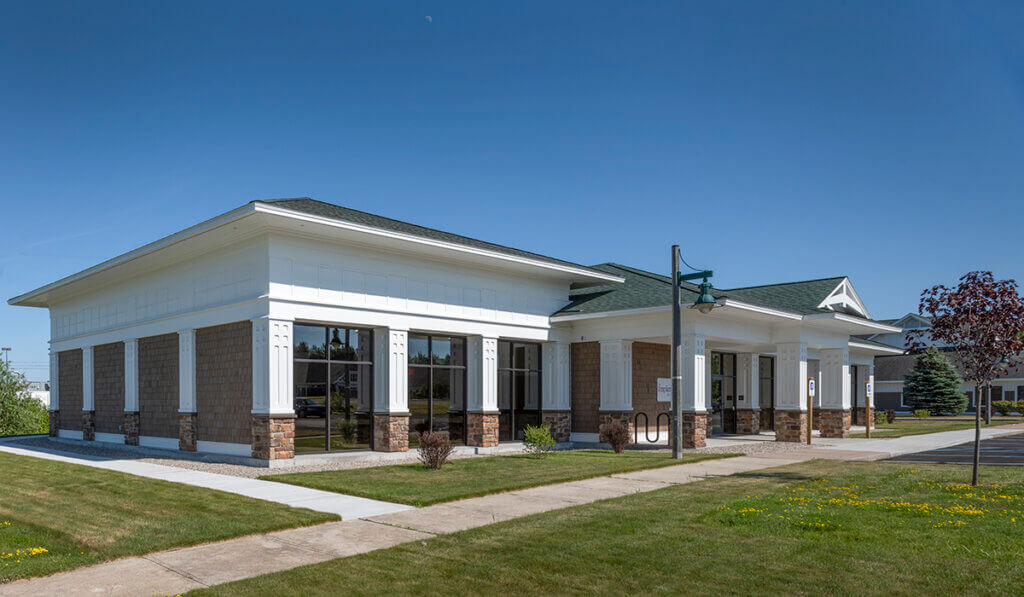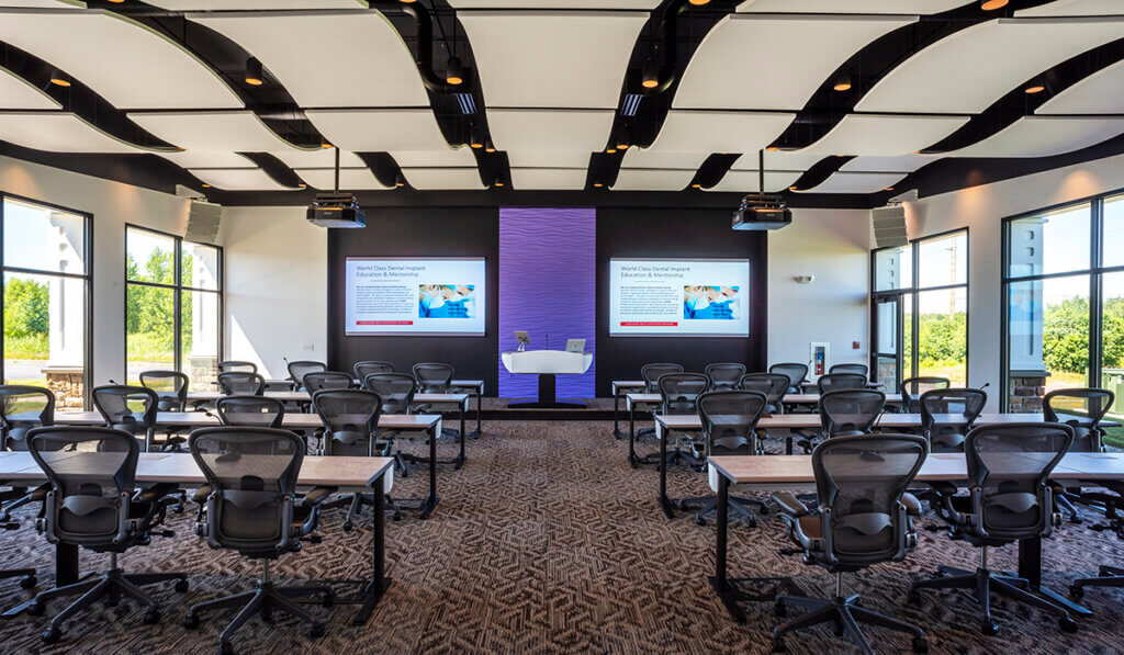 Stone accents, wood trim, and column details all work together to architecturally tie this new building to the existing surrounding buildings. The contemporary interior features black and white details, glass partitions, and a modern wave-like acoustical ceiling system in the education space.