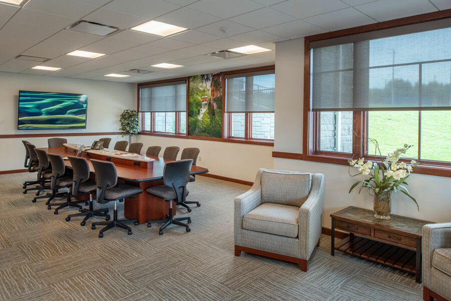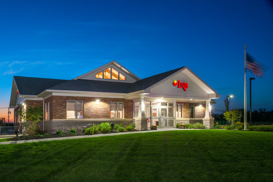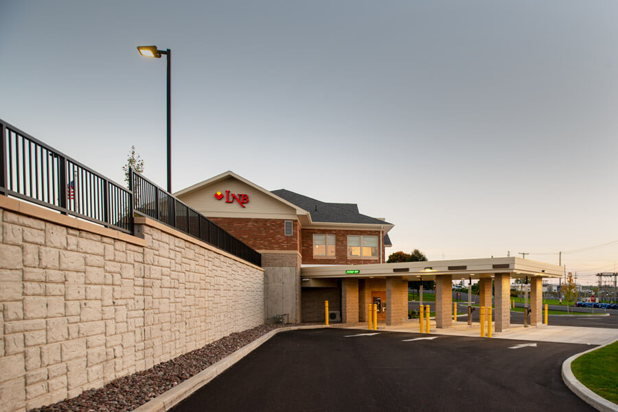 Beardsley began a process of evaluating an existing property to determine its feasibility and adaptability for a new Lyons National Bank branch location in Auburn, NY. The triangular site that was selected offered high visibility and road access from two directions, making it an ideal location. The change in topography, however, made it a challenge to fit programmatic needs, including parking, circulation, and access to a planned multi-purpose room for community-wide use. Considerable time and effort was invested in developing alternative approaches to a design that would satisfactorily meet all design and regulatory criteria.