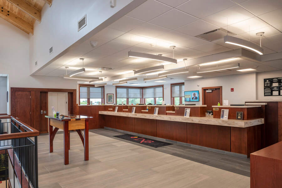 The two-story solution provides access from both upper and lower levels, visually and physically connected by means of an open stair and two-story atrium. The space features a vaulted ceiling with custom-designed laminated trusses and clerestory glazing at each gable end. The upper level is accessible from the main street entrance and parking area, and contains banking operations, customer service and managerial offices. The lower level is designed around the open atrium and accommodates additional offices, staff support, storage and mechanical rooms. In addition, it is organized to allow access to a lower-level multi-purpose room, including restrooms, while maintaining security during non-banking hours.