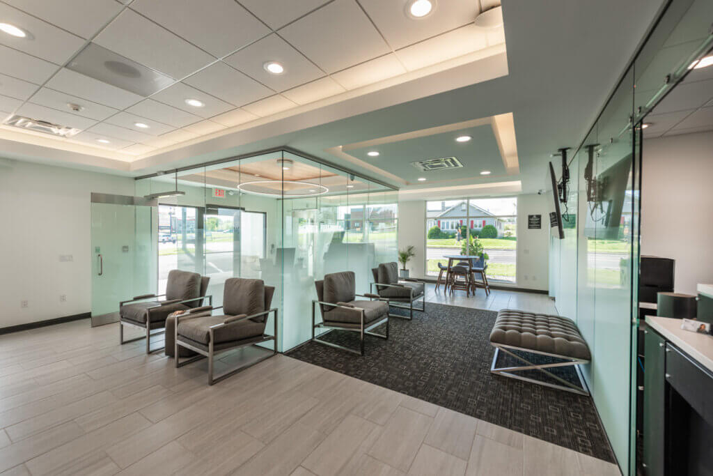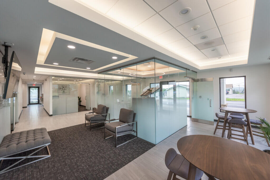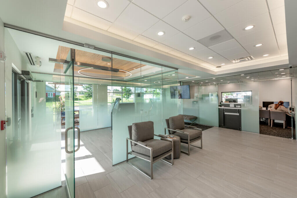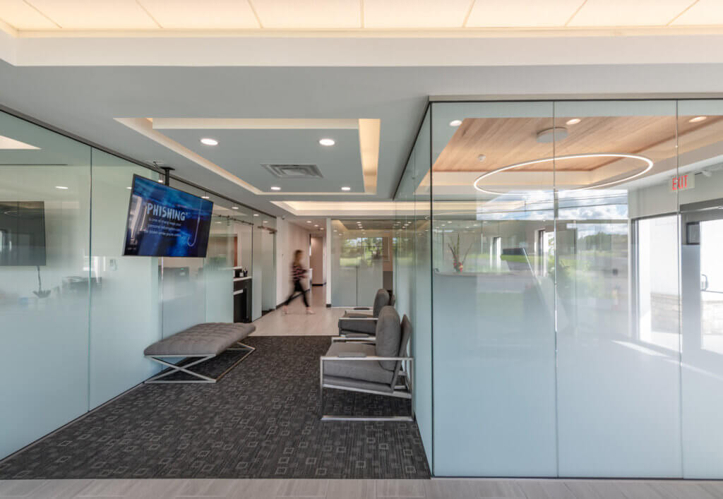 Modern glass partitions separate the space and clean, bright finishes, coupled with selective use of wood and carpet accents, create a modern feel while also fitting seamlessly within the bank’s existing branding. The use of gradation on the glass partitions allows light to travel through the entire space while also giving customers and tellers privacy when meeting with one another.